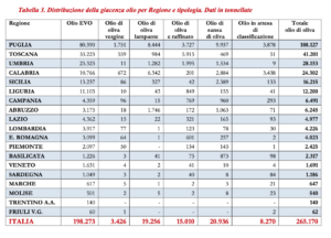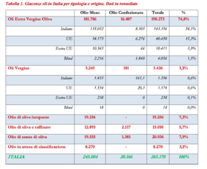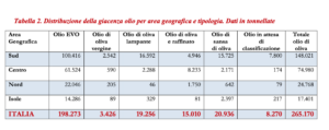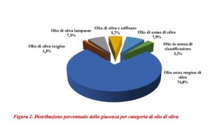 Solo l’1,3% delle giacenze è rappresentato dall’olio vergine di oliva.