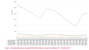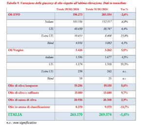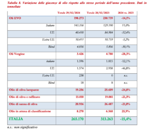 Nell’ambito dell’Evo è da segnalare il dato della quantità di prodotto di origine italiana che con 143.356 t risulta superiore del 11,0% rispetto al 28 febbraio 2023, ma non sufficiente a compensare la forte riduzione delle giacenze degli oli Evo di origine Eu (-52,4%).
