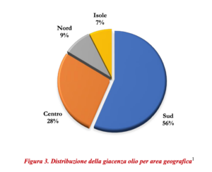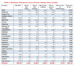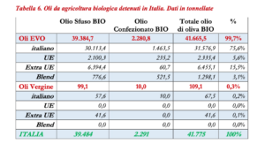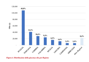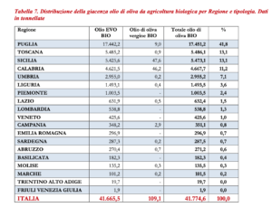 La giacenza totale di “olio extra vergine di oliva” e di “olio vergine di oliva” da agricoltura biologica risulta pari a 41.775 tonnellate (+7,6% rispetto allo stesso periodo dell’anno precedente), di cui il 99,7% Evo, pari al 21,1% dell’Evo complessivamente detenuto in Italia. L’olio Bio è detenuto prevalentemente in Puglia, Toscana, Sicilia e Calabria.