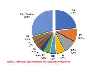 Il 55,8% della giacenza nazionale di olio di oliva è presente nelle regioni del Sud Italia, con il significativo contributo delle regioni Puglia e Calabria (40,8% e 9,2%, rispettivamente). A livello provinciale, da segnalare il 23,0% delle giacenze nella provincia di Bari e il 10,2% nella provincia di Perugia.