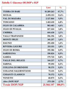 Nel complesso, l’olio a Dop/Igp in giacenza è pari al 7,5% del totale presente in Italia e costituisce il 10,0% dell’olio Evo stoccato.
